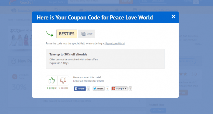 Peace Love World Coupon, Promo Codes: 15% Off - May 2022 Save with 38 Peace Love World Offers. 15% OFF Sale 15% Off Your First Purchase When You Sign Up For Peaceloveworld Emails See Details 15% OFF Code Limited Time Offer! Extra 15% Off Sitewide Added by TrishAloha Show Coupon Code See Details UP TO 75% OFF Sale Flash Sale! Up to 75% Off Women's Fashion Products See Details $25 OFF Code