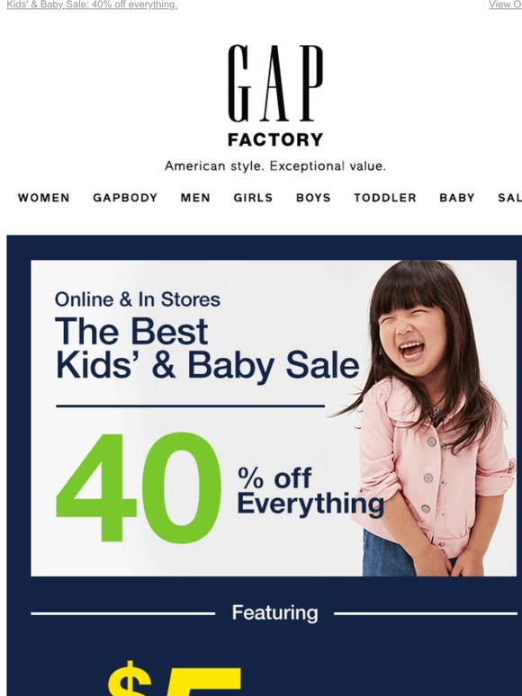 Everyday Deals On Clothes For Women, Men, Baby And Kids | Gap Factory Get great prices on great style when you shop Gap Factory clothes for women, men, baby and kids. Gap Factory clothing is always cool, current and affordable.