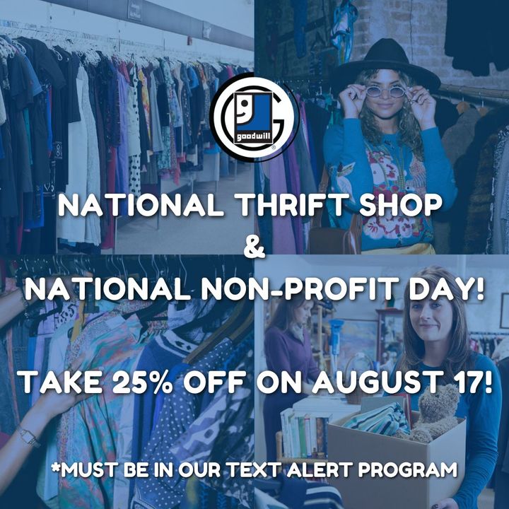 National Thrift Shop Day | Goodwill of Central and Northern Arizona Thrift Day is August 17th and your neighborhood Goodwill stores are celebrating with 25% OFF all clothing August 17th, 18th, and 19th, 2022. When you shop at Goodwill, you can find all kinds of amazing donated goods while on a budget.