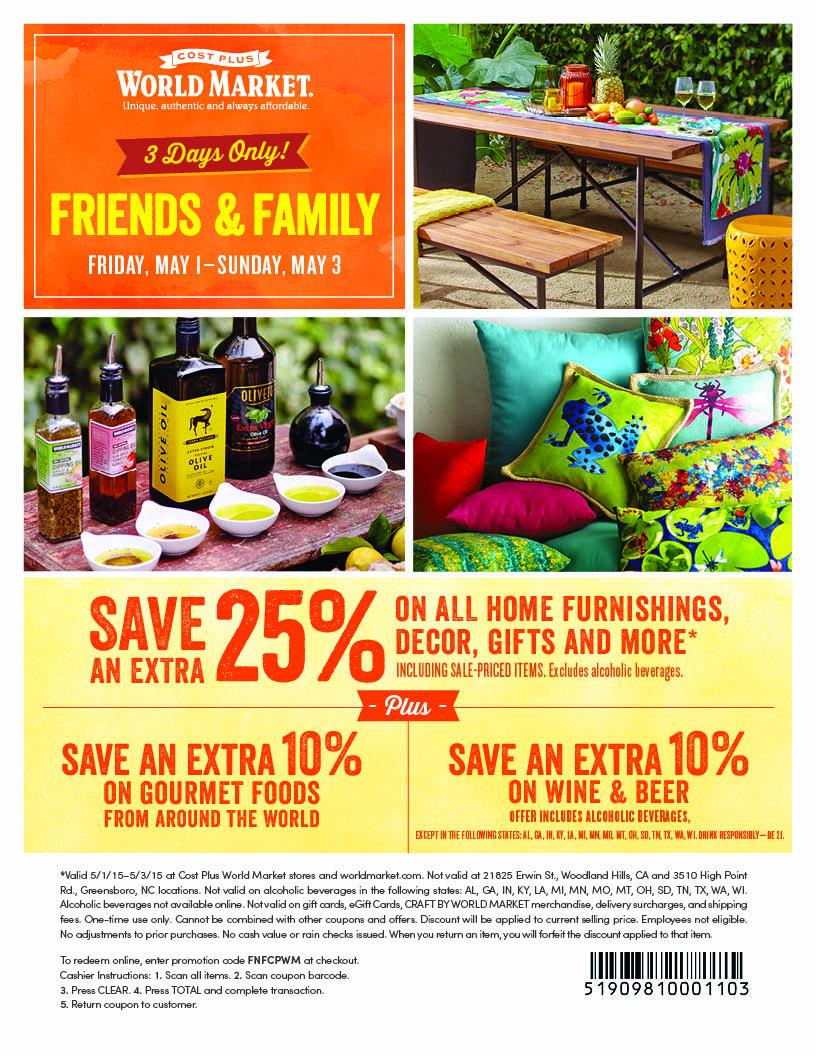 Extra 25% Off Entire Purchase | World Market World Market Coupons & Offers Amazing savings on a world of style Extra 25% Off Entire Purchase Valid 11/21/17-11/22/17 at Cost Plus World Market stores within the United States and worldmarket.com. Not valid at closing stores. Not valid on alcoholic beverages, gift cards, eGift Cards, One of a Kind Rugs, delivery surcharges, and shipping fees.