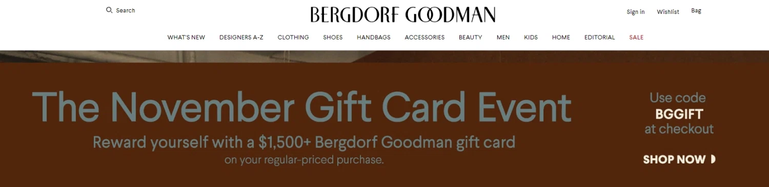 Bergdorf Goodman Coupons and Promo Codes | Nov 2022 - Slickdeals Get Up to $1,250 Free Gift Card w/ Coupon Code. Get Coupon Code. 1 Used Today. On any purchase of $500 or more get up to $1,250 of a Bergdorf Goodman Gift Card reward using a discount code. Enter coupon code at checkout. Some restrictions apply. 15%. off. Sale.